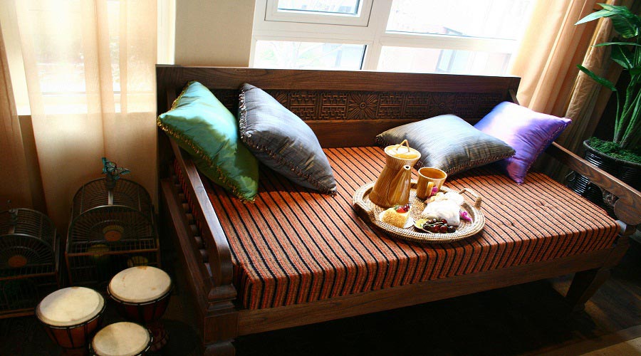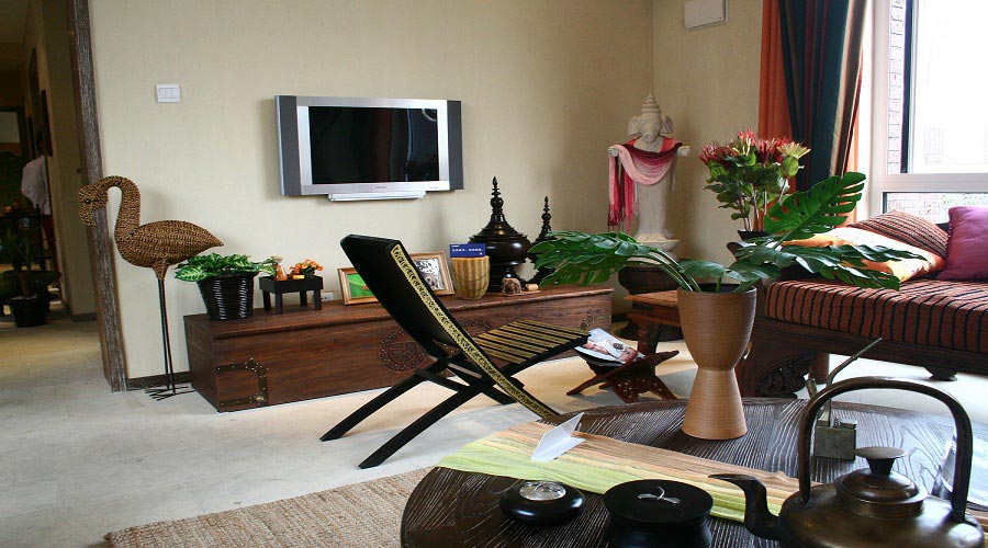 取材上以實木為主,主要以柚木(顏色為:褐色以及深褐色)為主,搭配藤制家具以及布衣裝飾(點綴作用),常用的飾品及特點有:泰國豹枕、砂巖、黃銅、青銅、木梁以及窗落等