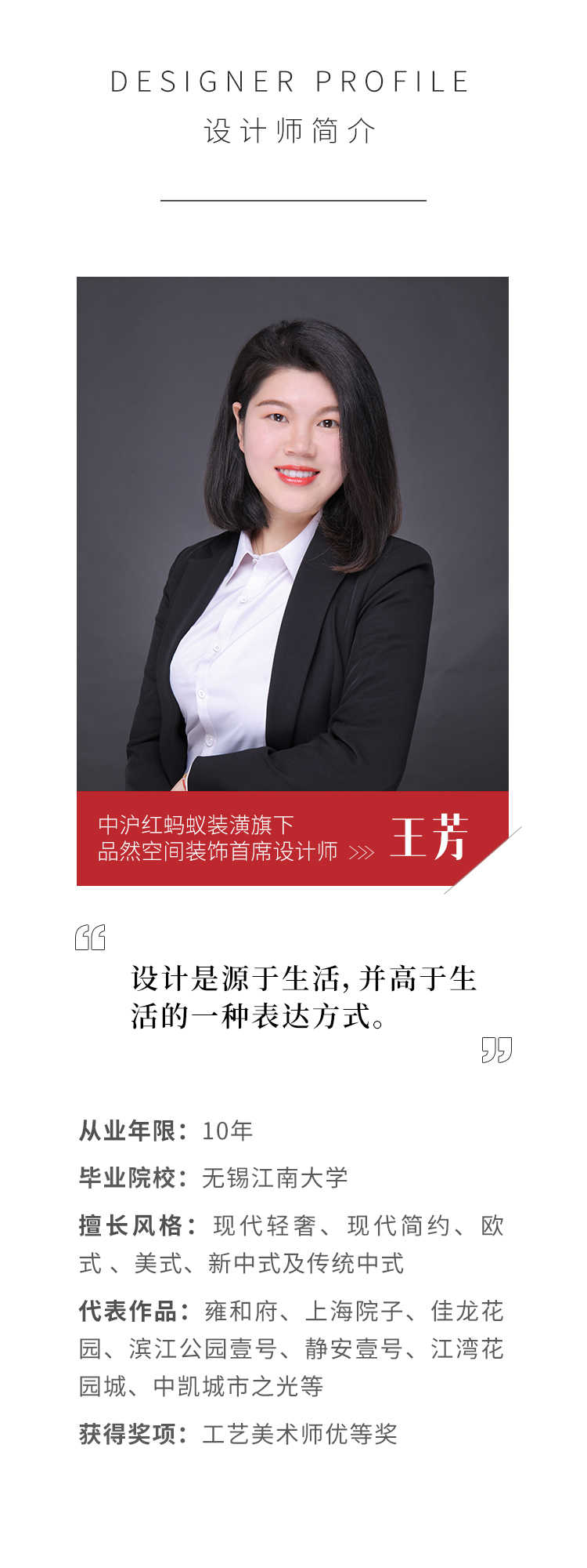 本期介紹中滬紅螞蟻裝潢旗下品然空間裝飾首席設計師——王芳,她和她的作品,對于設計都帶有生活的解讀。