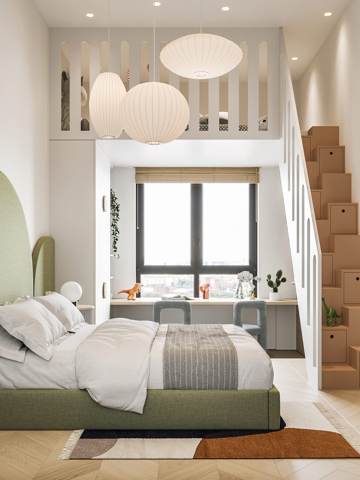 充滿趣味性的樓梯設(shè)計(jì)增加了大量的可存儲(chǔ)空間,直通頂層的玩具區(qū)。