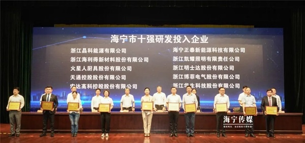 在5月26日舉行的“才聚潮城·科創(chuàng)海寧”2021年海寧市人才科技創(chuàng)新暨高質(zhì)量發(fā)展大會上,宏達高科被評為海寧市十強研發(fā)投入企業(yè)。