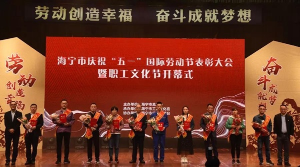 會上,10名2019年度海寧市最美職工、10名2019年度最美職工娘家人、20名海寧市第六批職業(yè)技能帶頭人和10家2019年海寧市“六好”品牌工會、11家2019年度海寧市高技能人才創(chuàng)新工作室受到表彰。宏達(dá)高科織造部陳國明被評為海寧市第六批職業(yè)技能帶頭人,并上臺接受表彰。