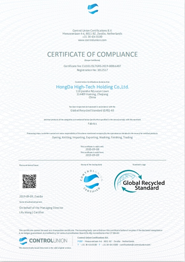 GRS認證的通過,將有助于“宏達高科”提升“綠色”和“環(huán)保”品牌形象,提高全球采購商的認可度,從而為更多的產(chǎn)品走向國際市場奠定基礎(chǔ)。