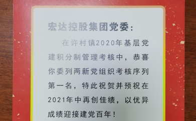 宏達(dá)控股集團(tuán)黨委在許村鎮(zhèn)2020年度基層黨建積分制管理考核中委列兩新組織..