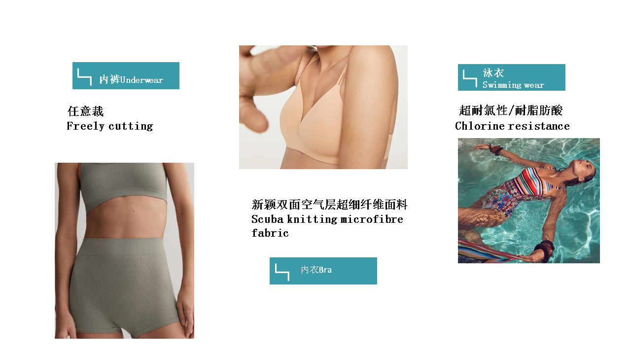 公司創(chuàng)造性的應(yīng)用進(jìn)口生產(chǎn)設(shè)備,精心采購國際優(yōu)質(zhì)原材料和染 化料,所生產(chǎn)的彈性和尼龍面料制作各種泳衣、潛水服、內(nèi)衣、 文胸、睡衣的理想面料,具有穿著舒適,觸感輕柔、恢復(fù)性好易 吸汗、不產(chǎn)生靜電等優(yōu)點(diǎn),系列產(chǎn)品被評(píng)為“浙江省高質(zhì)量科技 產(chǎn)品”。生產(chǎn)的網(wǎng)眼、起絨類經(jīng)編面料,更是運(yùn)動(dòng)衣、體操衣、 滑雪衣、球類衣等的上乘面料之選。目前,公司生產(chǎn)的系列面料 已通過Oeko-Tex Standard 100生態(tài)紡織品認(rèn)證,品質(zhì)達(dá)到 國際先進(jìn)水平,批量配套阿迪達(dá)斯等世界著名品牌,遠(yuǎn)銷歐美。